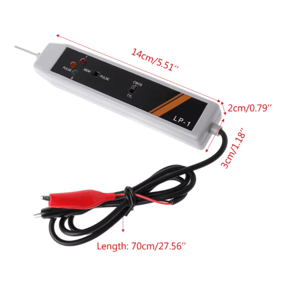 3.Pour détecter et stocker ou mettre à niveau, réglez la sélection inférieure sur le côté marqué « » en premier.Contactez la broche de la sonde avec le point à tester. Les LED indiqueront l’état basique. Ensuite, réglez le sélecteur inférieur sur le côté marqué « MEM ». La LED orange s’allumera lorsqu’un niveau quelconque est détecté. La direction, par rapport à la base, est déterminée. Après utilisation, réinitialisez la sonde en réglant le sélecteur inférieur sur le côté marqué « »